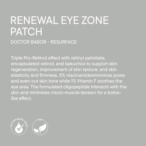 מדבקות Renewal Eye Zone Patch מסדרת DOCTOR BABOR RESURFACE מעניקות טיפול אינטנסיבי וממוקד לאזור העיניים. הפורמולה החדשנית משלבת קומפלקס עוצמתי של Triple Pro-Retinol יחד עם אוקטפפטיד, לשיפור מראה האלסטיות, המיצוק והאחידות של העור העדין סביב העיניים.